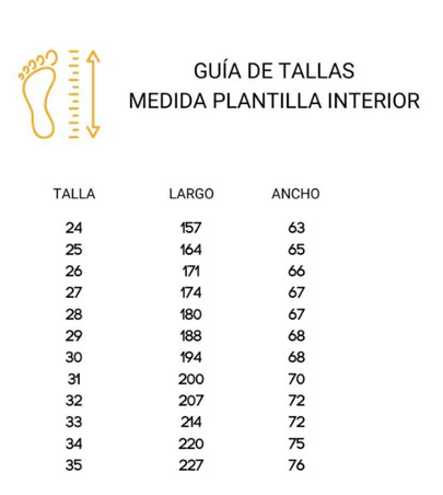 GUÍA DE TALLAS DE PLANTILLA INTERIOR (RECUERDA QUE EL PIE DEBE MEDIR ENTRE 0.8 Y 1.2CM MENOS QUE LA PLANTILLA)