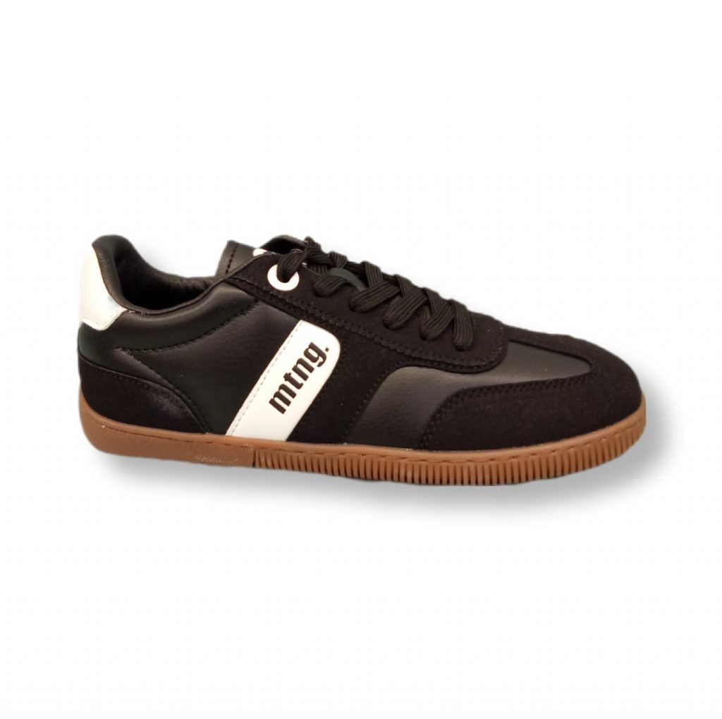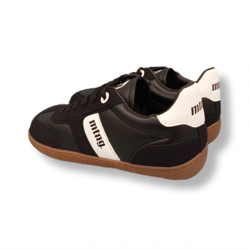 Presenta un diseño de inspiración retro indoor, esta zapatilla combina paneles de diferentes texturas en negro con detalle lateral blanco y suela de goma marrón.