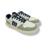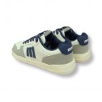 Este diseño combina una base lisa de color beige con paneles texturizados grises y cordones azul marino. El logo lateral y el talón resaltan en color marino.