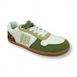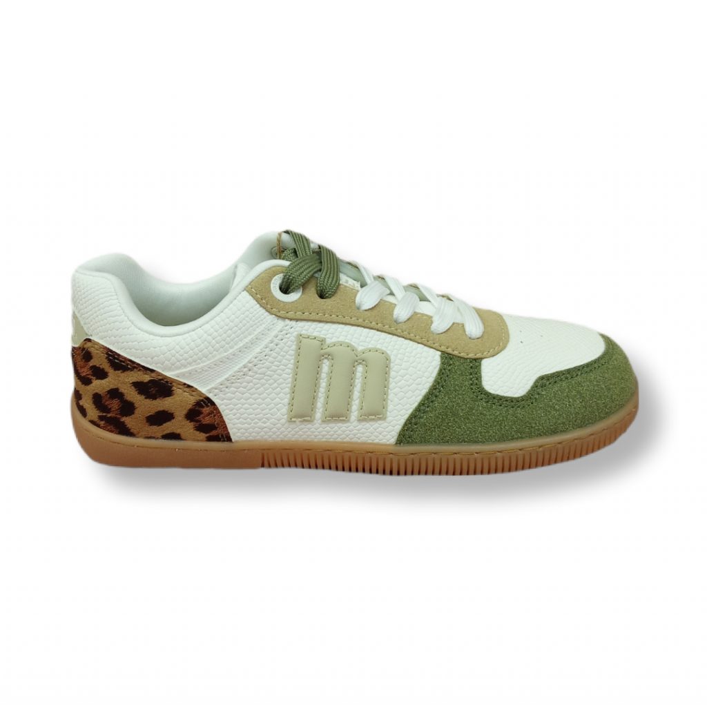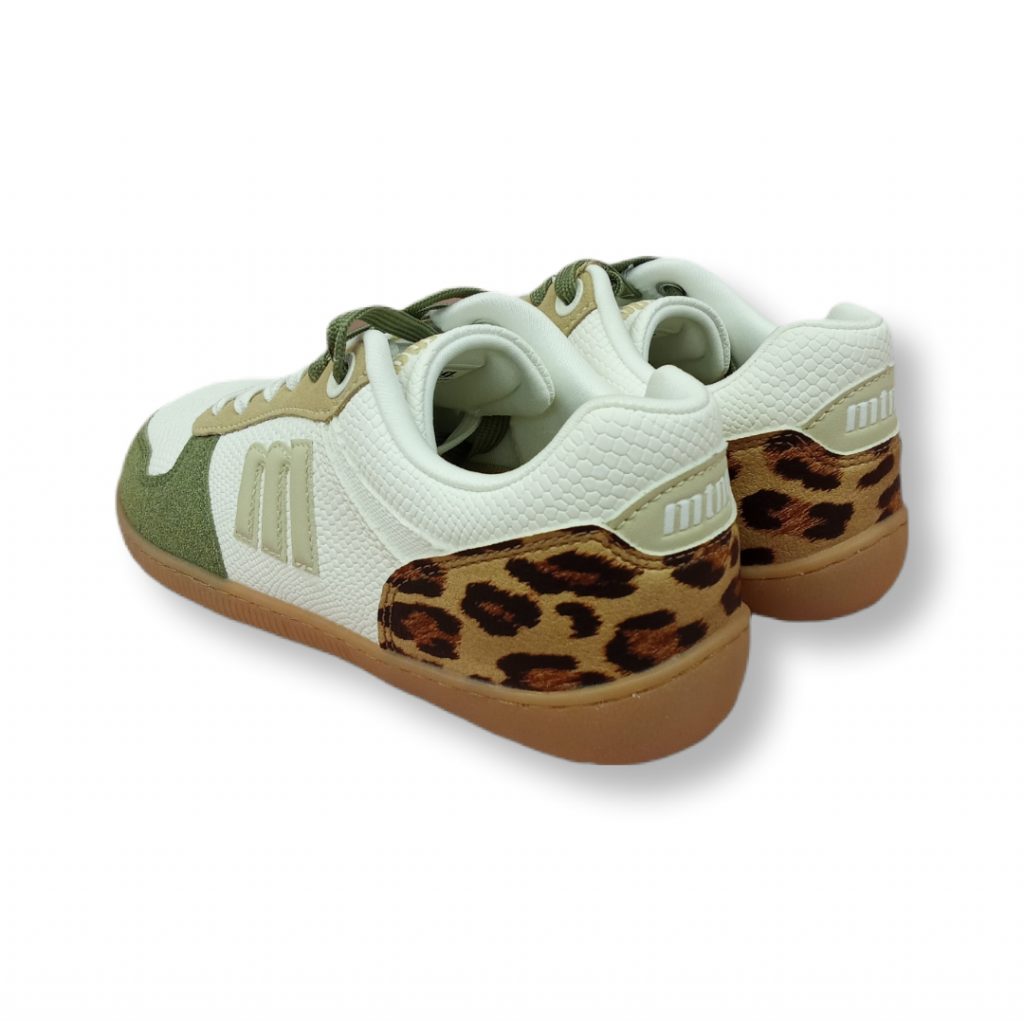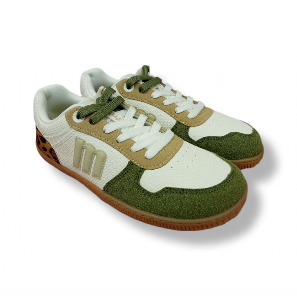 Zapatillas barefoot de la marca Mustang, modelo Free Aria de color blanco con detalles en verde y beige tipo ante. Este diseño combina una base texturizada con una trasera de animal print de leopardo que le aporta un toque actual y distintivo, mientras que los cordones bicolor en blanco y verde rematan un conjunto actual.